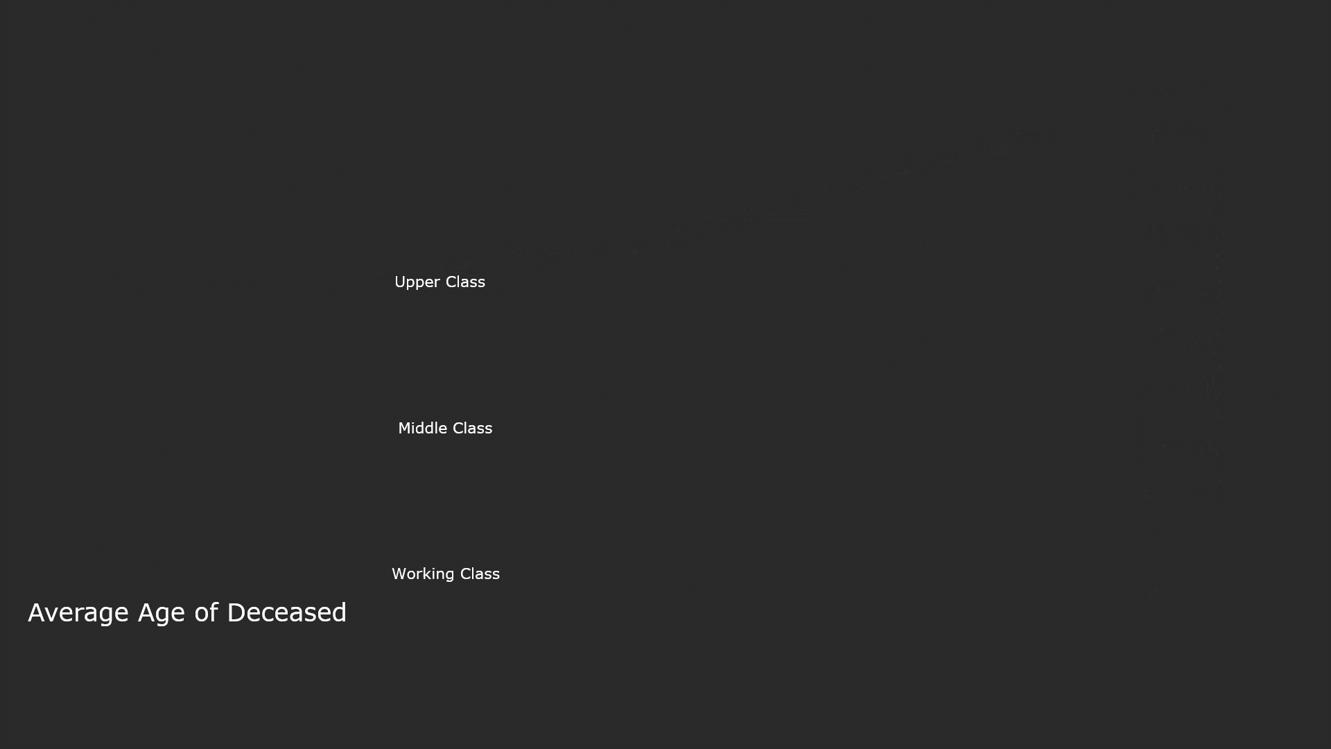In the year of 1839, 79 people from the upper class died, with an average deceased age of 44 years old. Number of deaths of those bourgeois, in contrast, was 824, ten times of the upper class, and the average deceased age was only 27. The working class, possessed a strikingly death number of 3,395, over 40 times of the gentry; however, the average age of deceased was only 19, equivalent to the age of a university freshman. Right now, things are much progress, with one in three people in Leeds are 50 years old or over. The average expectant age reaches 80 years old.